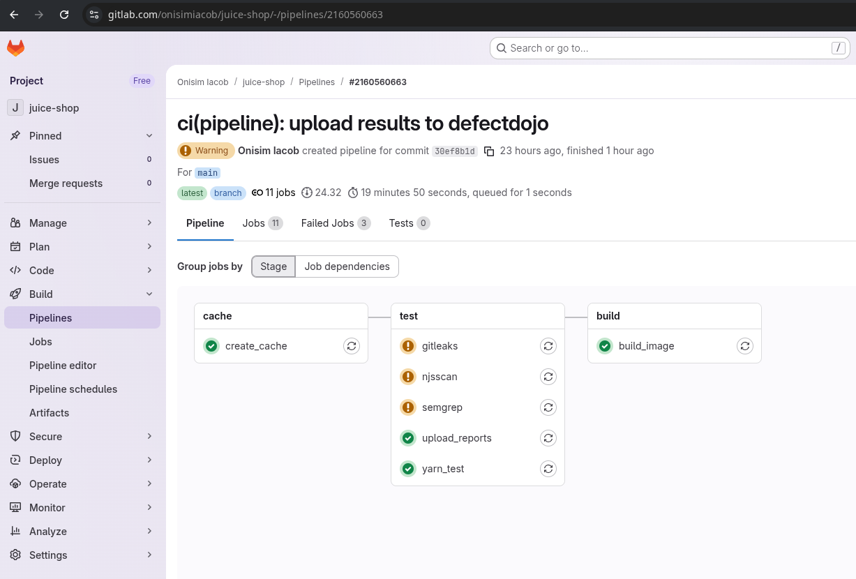 However, this is how the complete CICD pipeline looks like. I also added the "DEFECTDOJO_API_KEY" as a variable to the code, to avoid hardcoding any secret value.